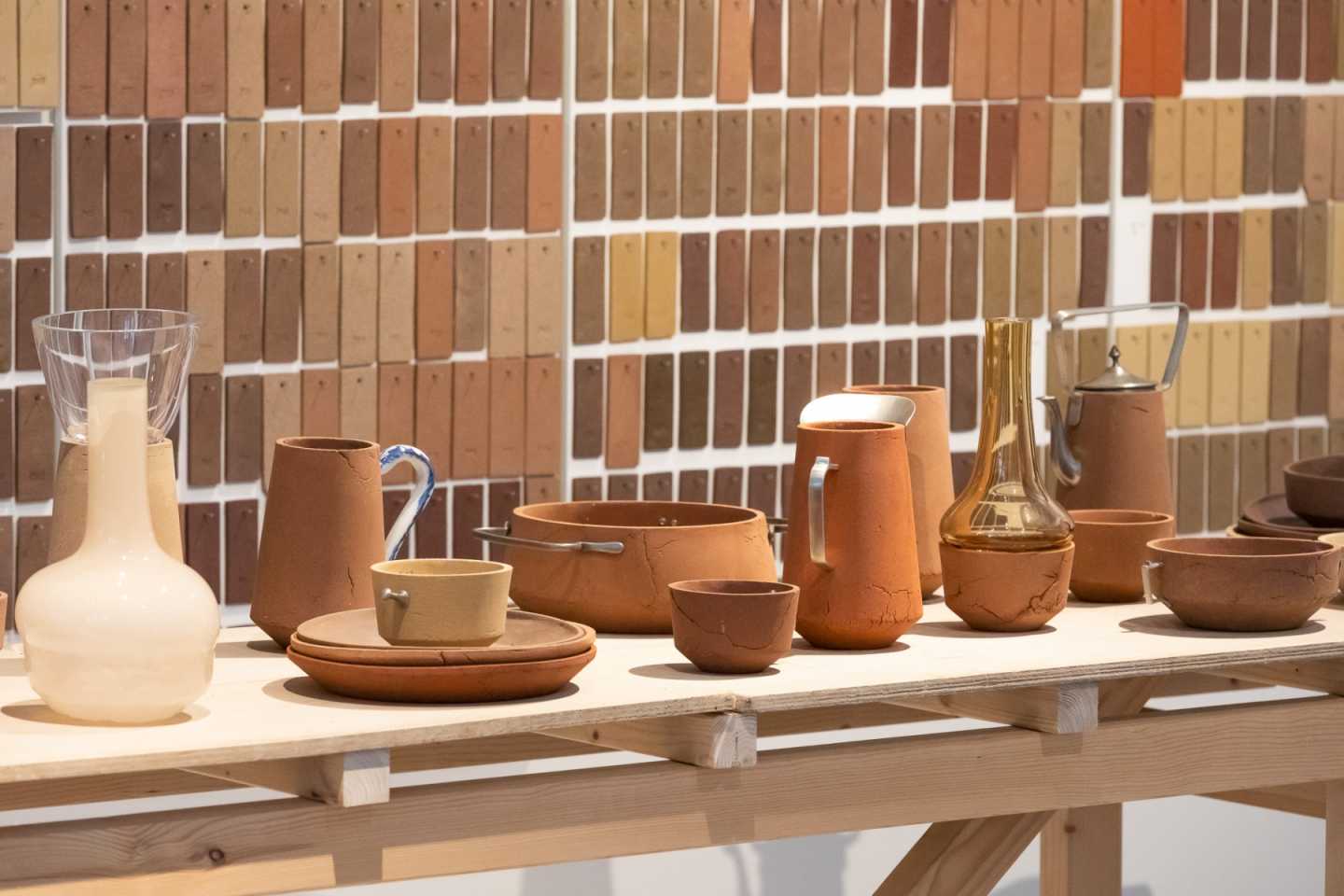 At Atelier NL, the earth is an integral component to both the meaning and design of their work. Unlike the industry, which seeks homogeneous products made from pure raw materials, they embrace the very imperfections and colours that minerals in the earth produce. Much research has gone into uncovering what each soil produces and brings the craft of making to another level by placing importance on the concept of place visualized through colour. In many of the clay and sand samples Atelier NL has collected from across the Netherlands and Europe, iron oxide (Fe2o3) often proves to be a defining element. More iron means that both ceramic and glass will produce a darker colour once fired at high temperatures; ceramic becomes a rich burnt red and glass a deep forest green. The handmade ‘ClayService’ and mouth-blown ‘ZandGlas’, created after much trial and error, showcase the terrestrial colours and material structures that speak to the land from which the clay and sand have been sourced. In every edition, each piece is stamped with its corresponding location as a means of maintaining the connection to place and material origin. Atelier NL now presents a reconfiguration of their entire material archive — from raw materials to ceramic and glass objects — by displaying them from least to most ferriferous, unearthing a fascinating colour spectrum.