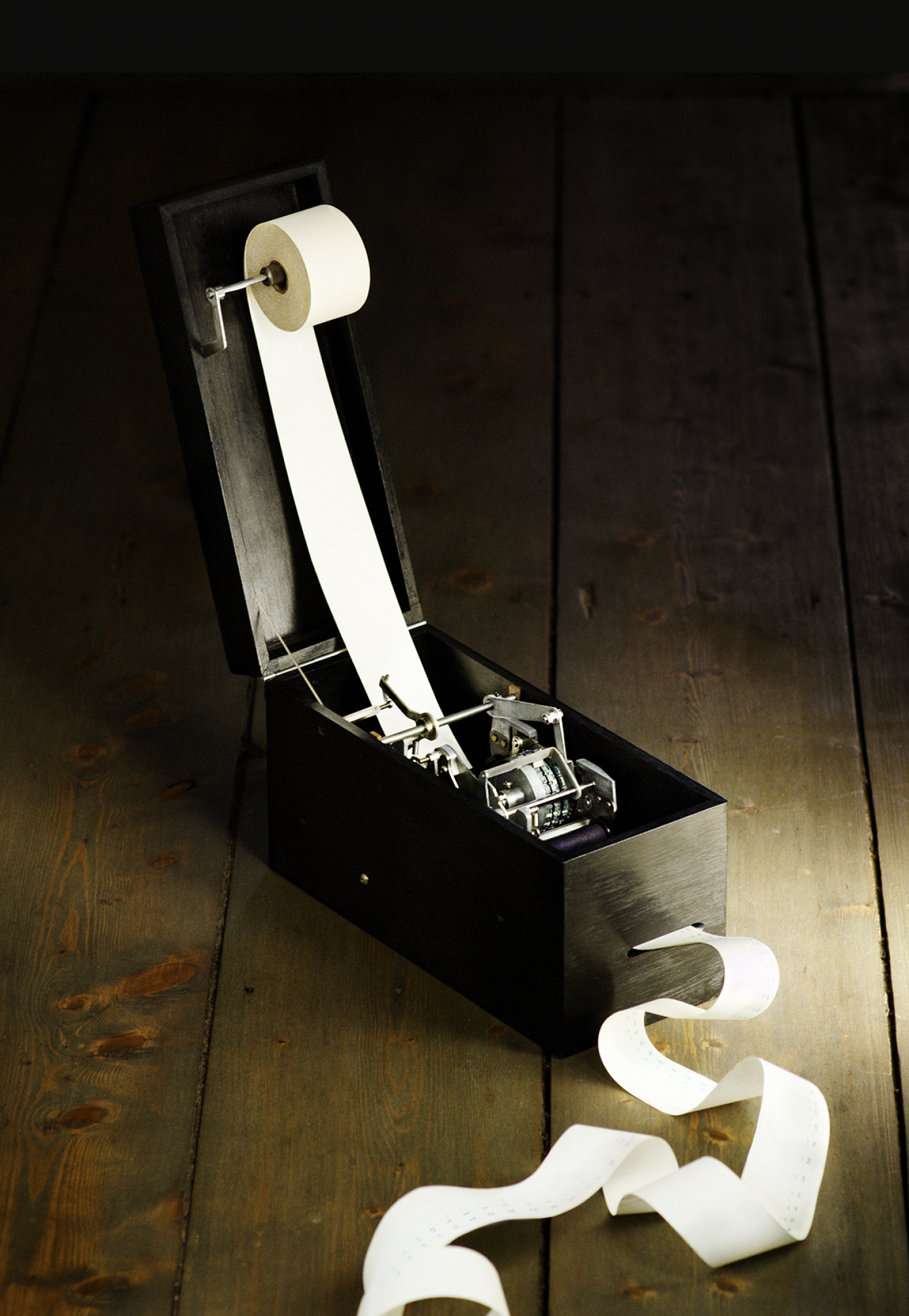 The Timewriter is a mechanical instrument made to measure and register time. Using four numerical stamps it imprints time, tracing it, on paper every minute. Time is described and recorded as a continuous linear progression. In contrast, on a traditional clock, time moves in an infinite circular path at 360° a minute, 360° an hour. The future becomes present, the present becomes past, the past becomes future. Constantly replacing each other around and around the clock, the three states of time become indefinable. In a new take on time, the Timewriter creates a physical recording, revealing the accumulation of time.