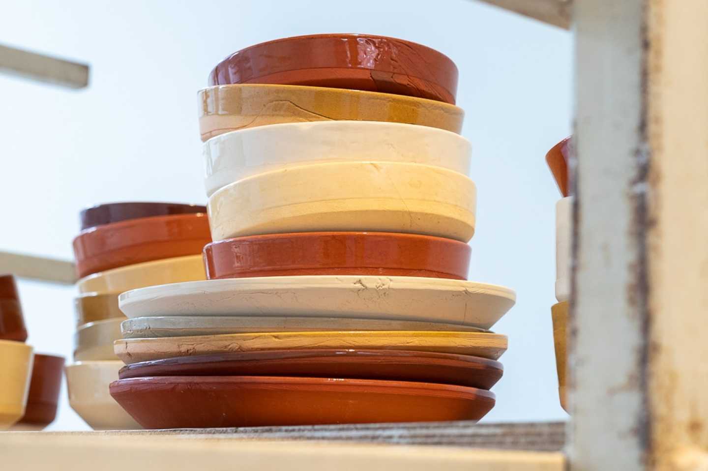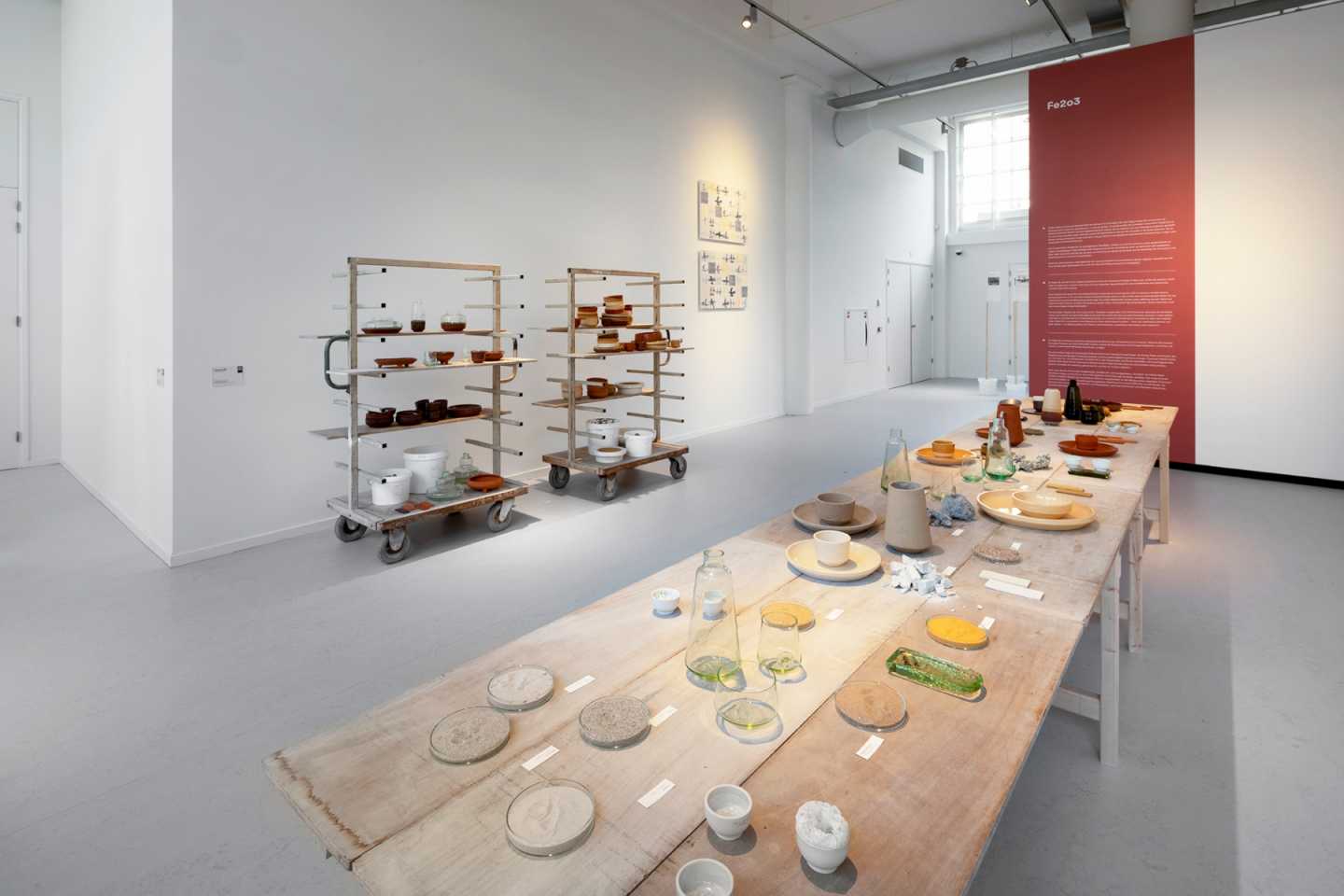 At Atelier NL, the earth is an integral component to both the meaning and design of their work. Unlike the industry, which seeks homogeneous products made from pure raw materials, they embrace the very imperfections and colours that minerals in the earth produce. Much research has gone into uncovering what each soil produces and brings the craft of making to another level by placing importance on the concept of place visualized through colour. In many of the clay and sand samples Atelier NL has collected from across the Netherlands and Europe, iron oxide (Fe2o3) often proves to be a defining element. More iron means that both ceramic and glass will produce a darker colour once fired at high temperatures; ceramic becomes a rich burnt red and glass a deep forest green. The handmade ‘ClayService’ and mouth-blown ‘ZandGlas’, created after much trial and error, showcase the terrestrial colours and material structures that speak to the land from which the clay and sand have been sourced. In every edition, each piece is stamped with its corresponding location as a means of maintaining the connection to place and material origin. Atelier NL now presents a reconfiguration of their entire material archive — from raw materials to ceramic and glass objects — by displaying them from least to most ferriferous, unearthing a fascinating colour spectrum.