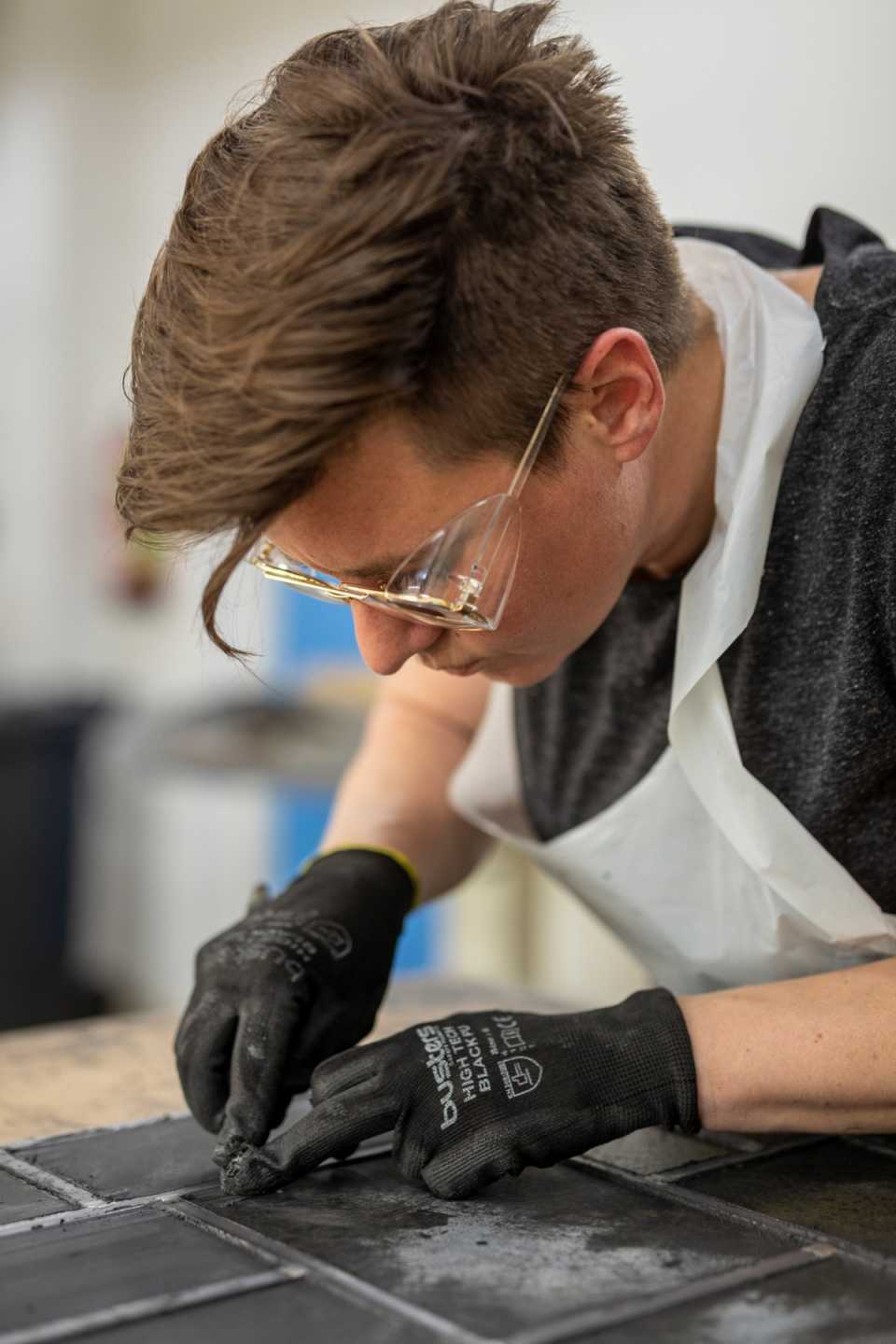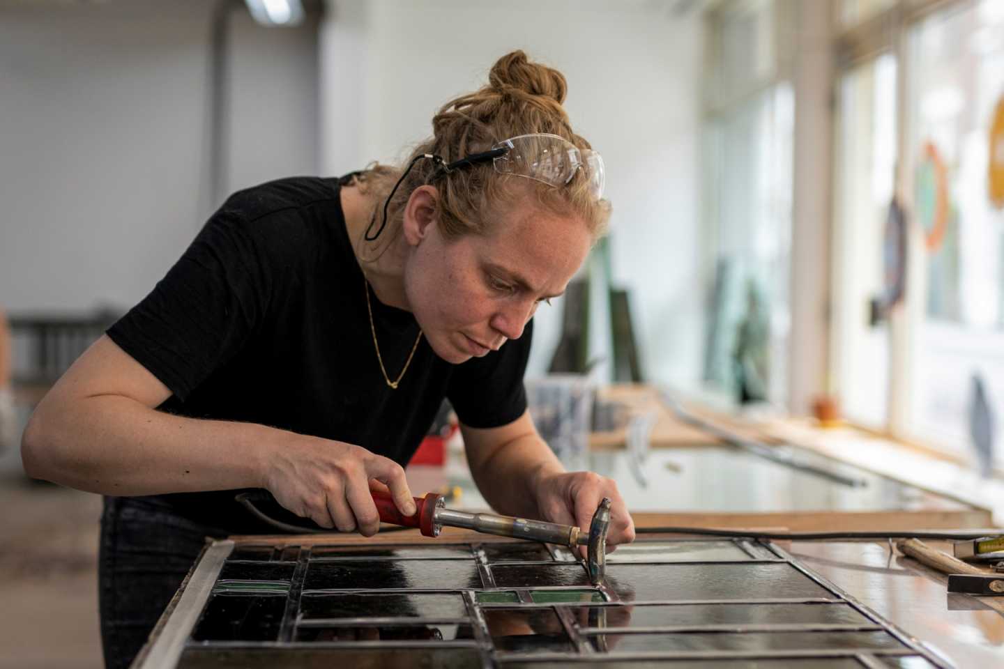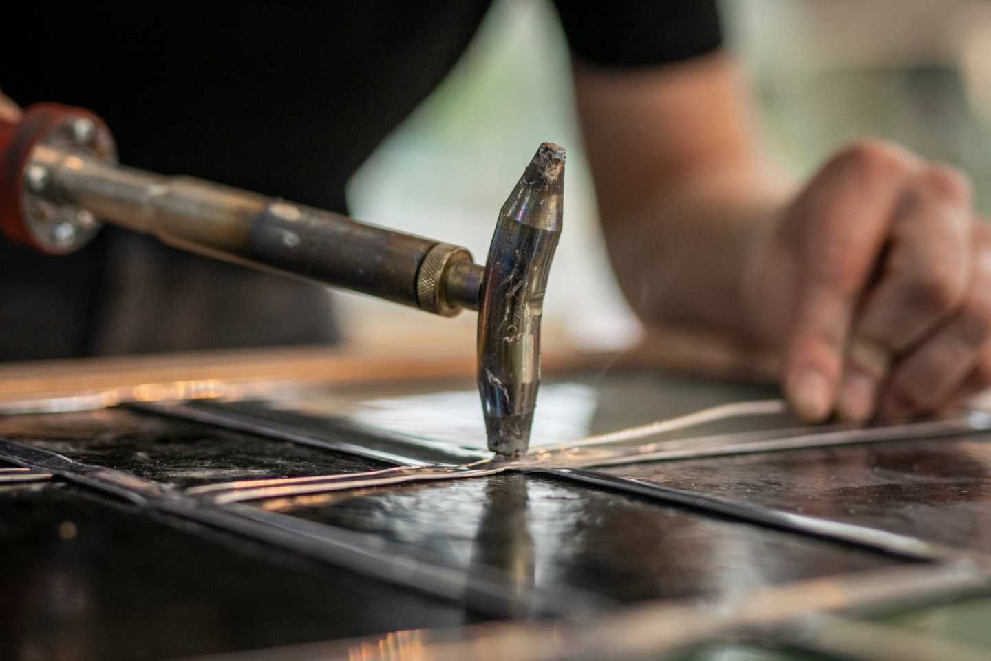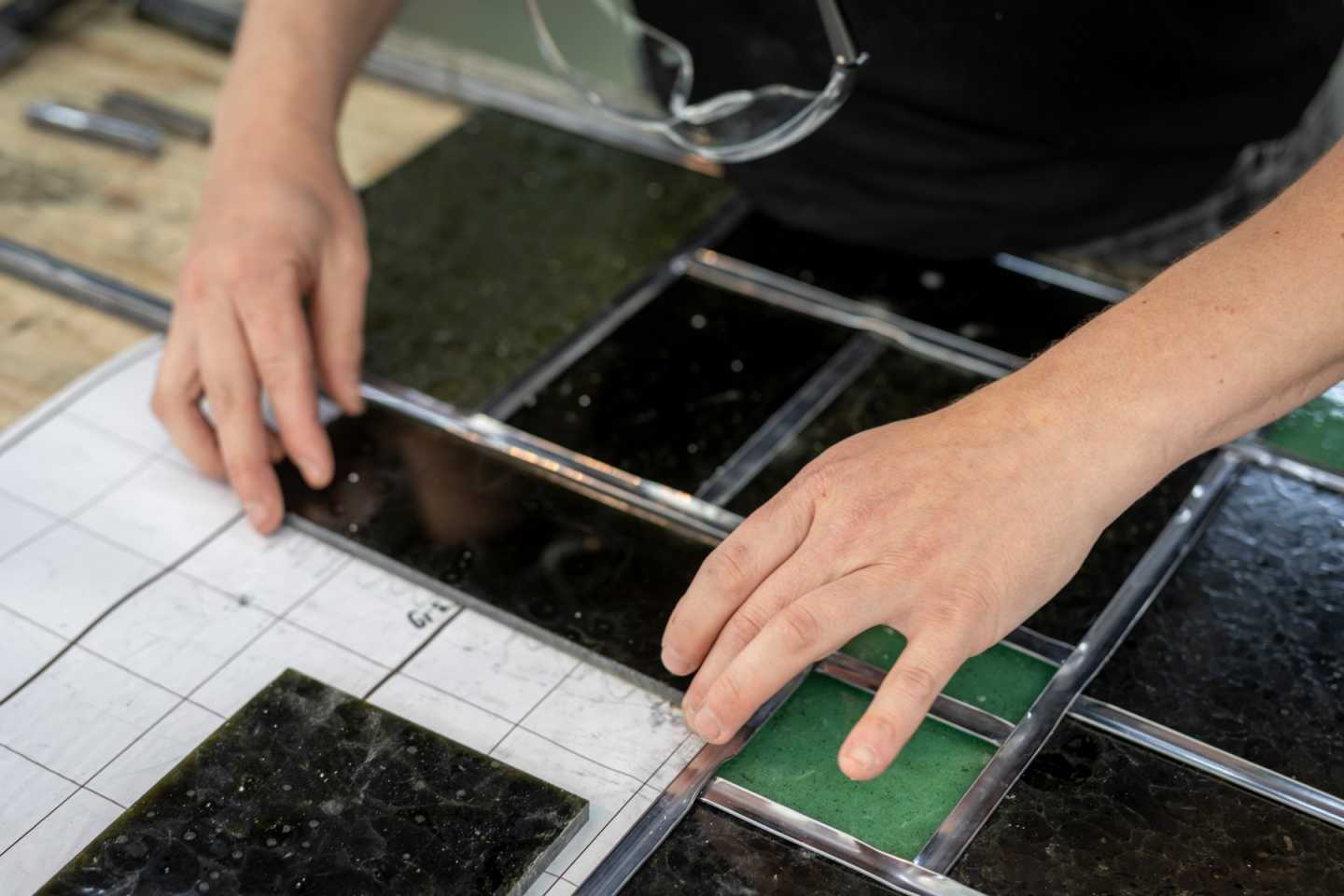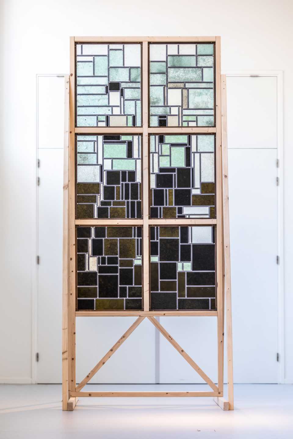 De ZandScheppers is made from the repurposed glass from our ZandGlas series. In this stained glass window the sands of Zandmotor, Savelsbos, Brabantse Duinen, Maasvlakte, Terschelling, Knokke, Vlieland, Bergen Op Zoom and Leiden come together to form an artwork that speaks of the land and our connection to it. This stained glass portrait of Atelier NL stems from an image made by photographer Paul Scala.